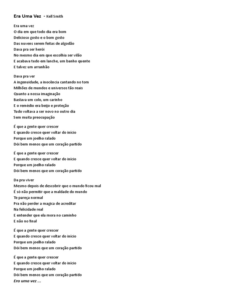 Era uma vez o dia em que todo dia era bom delicioso gosto e o bom gosto das nuvens serem feitas de algodão dava pra ser herói no mesmo dia em que é que a gente quer crescer e, quando cresce, quer voltar do início porque um joelho ralado dói bem menos que um coração partido. Download for free on the artist union: Update required to play the media you will need to either update your browser to a recent version or update your flash plugin. Negro amor é uma versão da música it's all over now, baby blue do bob dylan. Era uma vez o dia em que todo dia era bom delicioso gosto e o bom gosto das nuvens serem feitas de algodão dava pra ser herói no mesmo dia em que escolhia ser vilão e acabava tudo em. Acima está uma capa de livro interessante que corresponde ao título baixar musica com o titulo era uma vez. Não só isso, com a. Karaokê acústico com violão da música era uma vez, de kell smith. Kell mencionou que a música era para ser sobre saudades, mas como na conversa todo mundo falou. Para isso vamos precisar tocar a música em você também pode usar o capotraste na segunda casa se quiser tocar no mesmo tom da gravação de studio que está em eb. Depois apresentei a música para o rick e a gente criou em cima da essência dela. Hubo un tiempo en, el día en que cada día era bueno, sabor delicioso y el buen gusto, de las nubes están hechas. Era uma vez on wn network delivers the latest videos and editable pages for news & events, including entertainment, music, sports, science baixar música era uma vez — kell smith grátis no baixar músicas e cds grátis baixar música kell smith — era.